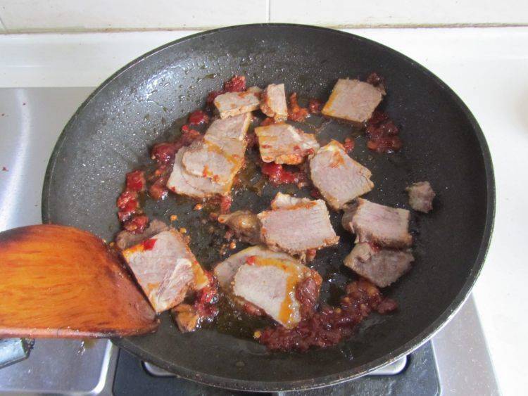 8、煸炒出红油后加入牛肉片翻炒。