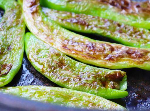 锅里放1勺油,青椒下锅煸炒,用锅铲不断挤压。