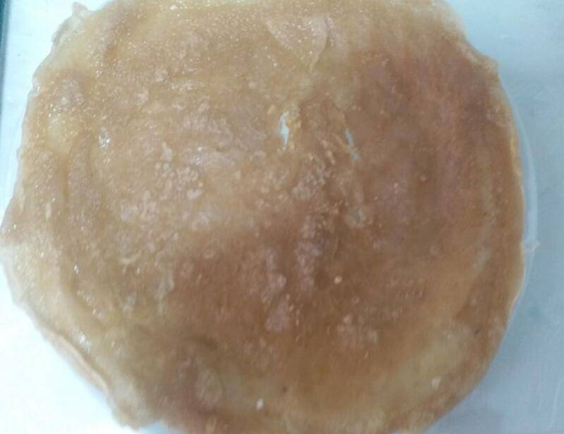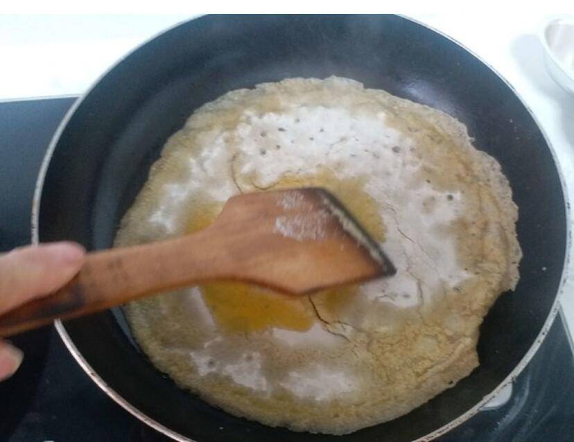 5、等面糊凝固后,倒点食油,用木铲把油推开,尽量推满整个粉皮。