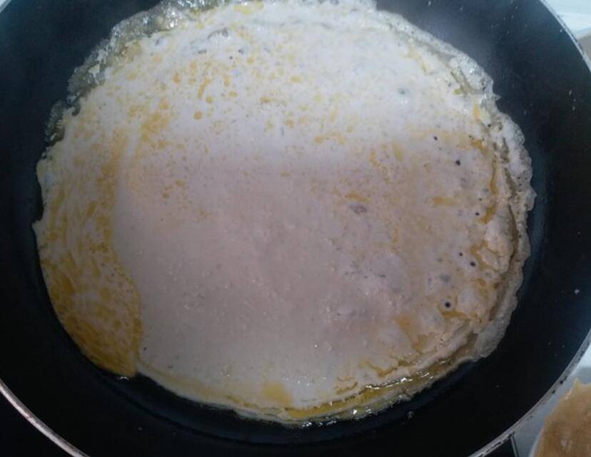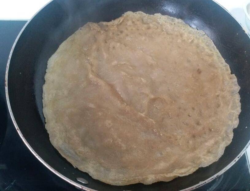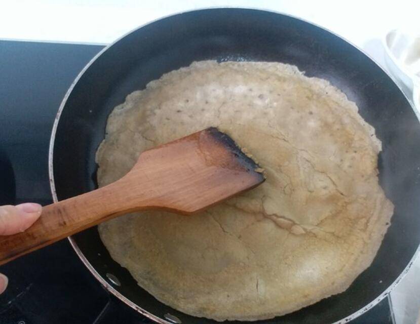7、等粉皮上没有白色的淀粉,就可以轻轻的翻面再煎制另一面。