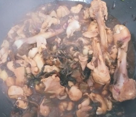 倒入鸡肉,鸡骨一起大火翻炒,炒到鸡肉发白,再调入适量的料酒、老抽翻炒均匀;
