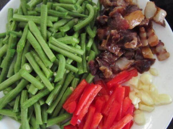 2.腊肉切薄片,豇豆切小段,红尖椒去皮切小段,蒜切粒。