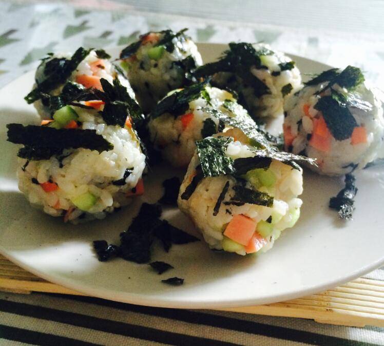 最佳答案用料:青瓜、红萝卜、香肠、黑芝麻、海苔、香油、酱油。做法:1、红萝卜、香肠、青瓜切丁。2、青瓜、红萝卜、香肠、芝麻、香油、海苔放入米饭中。3、米饭和材料搅拌均匀,戴上一次性手套,把米饭捏成球状。4、装碟,再撒上一些海苔装饰即可。