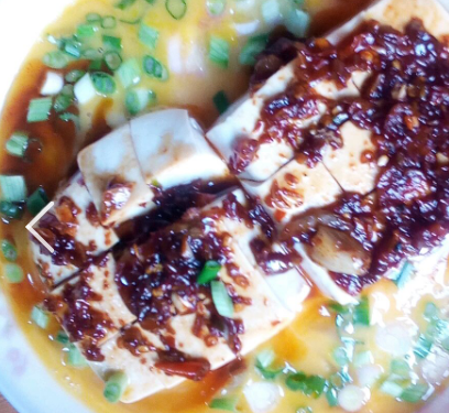 水豆腐2块、鸡蛋2个葱少许。自制辣椒酱小半勺、盐少许、酱油5ml、椒盐粉少许。
