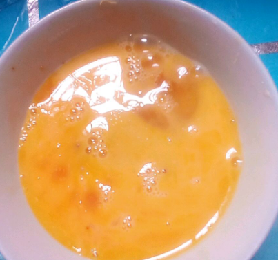 两个鸡蛋,打入碗中,加点盐调味,搅拌备用。