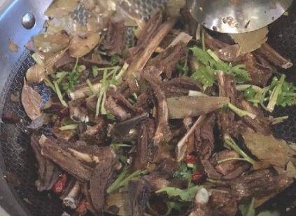 4、另起锅把辣椒和香叶炒出香味倒入羊排翻炒;