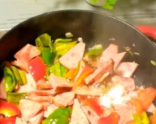 最佳答案准备食材:火腿200克、青椒50克、红椒50克、葱、姜、蒜适量、料酒10克、白糖5克、盐2克、鸡精2克。热油下葱姜蒜爆香。倒入料酒煸香。倒入火腿片翻炒2分钟。倒入青红椒翻炒一分钟。倒入调料翻炒均匀出锅。