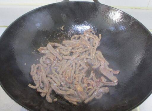 3、把牛肉丝倒入煸炒至全部变色后捞起。