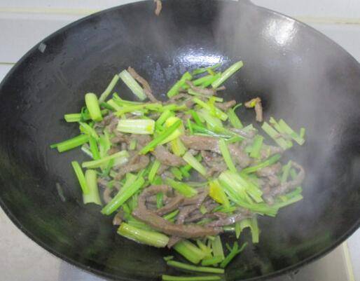 5、再把牛肉丝回锅,煸炒均匀至芹菜断生后出锅即可。