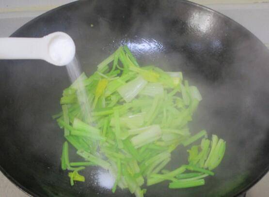 4、把芹菜倒入,不断的煸炒至出香味后加盐调味。