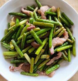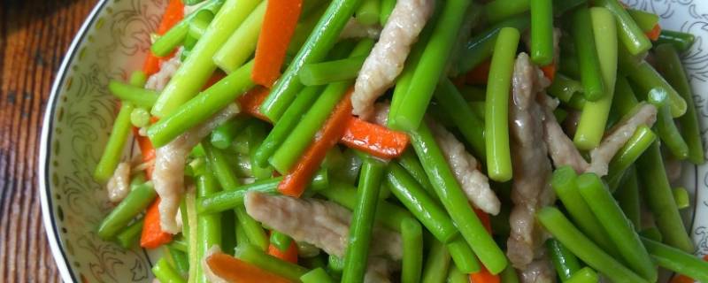 用料:蒜毫适量、盐、瘦肉适量。1、蒜毫切好后将其焯水。2、锅热倒油,下肉不断翻炒。3、放入蒜毫,加盐调味继续翻炒。4、待肉焦黄,蒜毫表皮较皱时即可将其盛出。