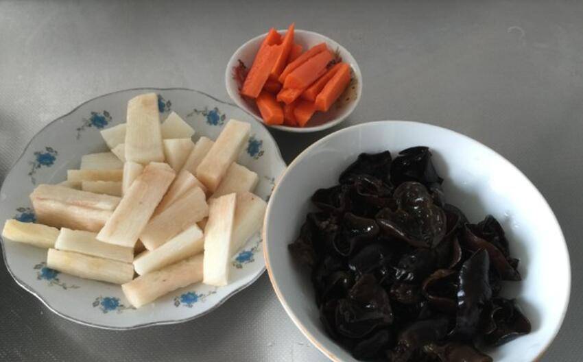主料:黑木耳100克、胡萝卜半个、山药200克、盐1小勺、鸡精少许、蒜瓣3个、葱2棵。
