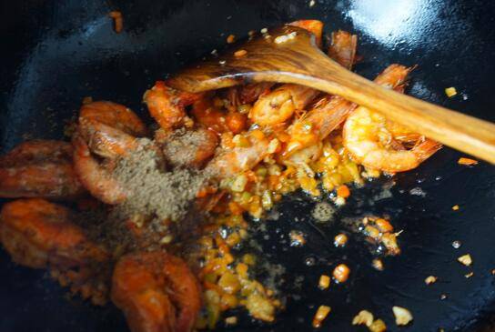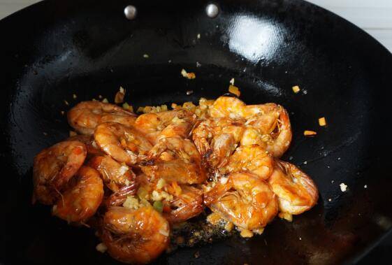 8、虾下锅翻炒均匀,滴入几滴醋会保持虾皮的脆度。