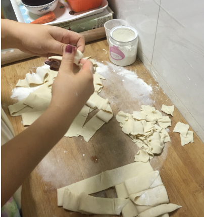 将面用手撅成一块块,如果手快可直接在开水锅前撅,可以防粘。