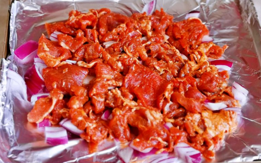 5、再把腌制好的牛肉片放在洋葱上,尽量把牛肉片摊开。