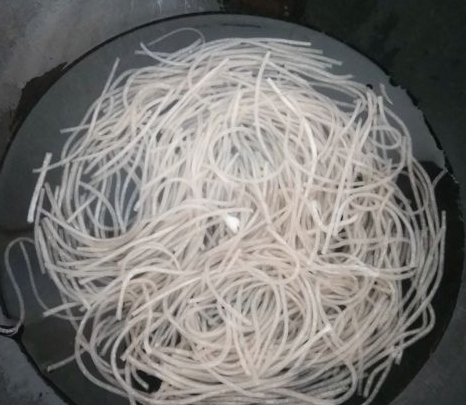锅中放入清水烧开,再放入粉条煮软,捞出来再冲下凉水,沥掉水分。