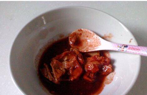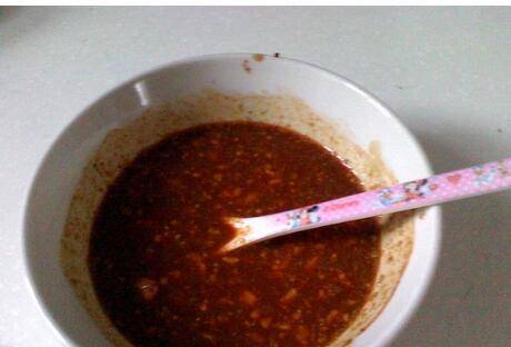 腐乳取出碗里用勺子压碎。