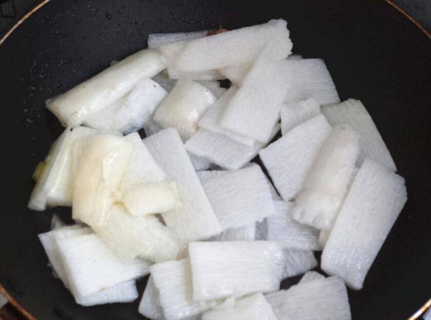 4、再起油锅,葱姜入锅煸香后,山药入锅炒。
