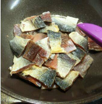 2、锅里放油将腊鱼煎炒一下倒出来。