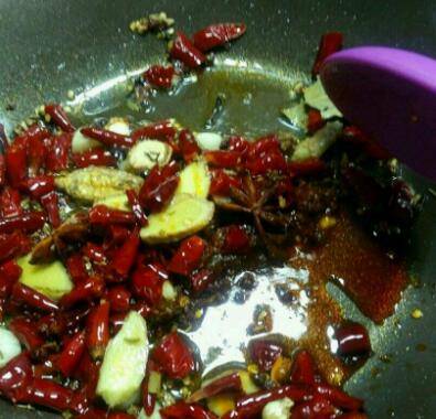 3、重新起油爆香辣椒,花椒,姜和蒜。