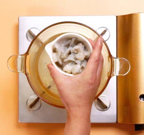3、虾仁开水入锅,焯水10秒。