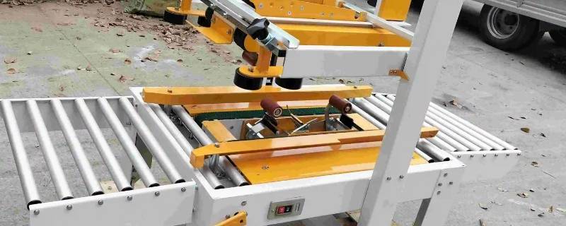 1、产品装箱后经输送链(带、辊)送入封箱机,并递交给输箱机构,由夹箱皮带夹住纸箱的两侧面,向前运动;