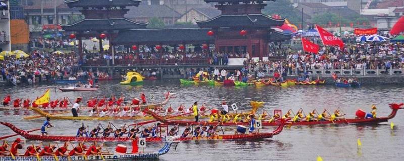 3、赛龙舟:赛龙舟是中国端午节的习俗之一,也是端午节最重要的节日民俗活动之一,在中国南方地区普遍存在,在北方靠近河湖的城市也有赛龙舟习俗,而大部分是划旱龙舟舞龙船的形式。关于赛龙舟的起源,有多种说法,有祭曹娥,祭屈原,祭水神或龙神等祭祀活动,其起源可追溯至战国时代。