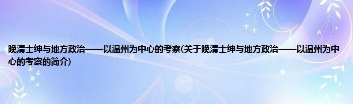 本文关于晚清士绅与地方政治——以温州为中心的考察的简介就讲解完毕,希望对大家有所帮助。
