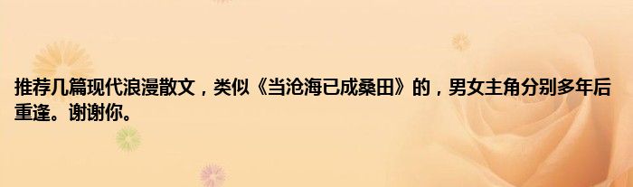 大家好,小常来为大家解答以上问题。推荐几篇现代浪漫散文,类似《当沧海已成桑田》的,男女主角分别多年后重逢。谢谢你。很多人还不知道,现在让我们一起来看看吧!