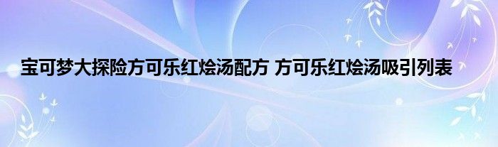宝可梦大探险方可乐红烩汤配方是什么?宝可梦大探险里的料理最主要作用就是吸引怪物,不同的料理会吸引到不同的宝可梦。其中方可乐红烩汤料理应该是比较好猎取的,那么这个配方具体的内容是什么呢?一起来看看吧。
