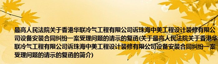 本文关于最高人民法院关于香港华联冷气工程有限公司诉珠海中美工程设计装修有限公司设备安装合同纠纷一案受理问题的请示的复函的简介就讲解完毕,希望对大家有所帮助。