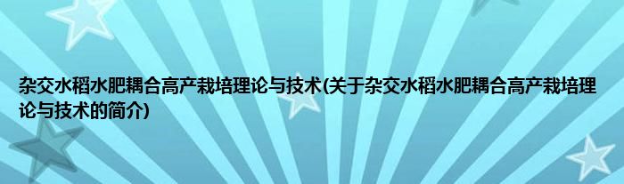 本文关于杂交水稻水肥耦合高产栽培理论与技术的简介就讲解完毕,希望对大家有所帮助。